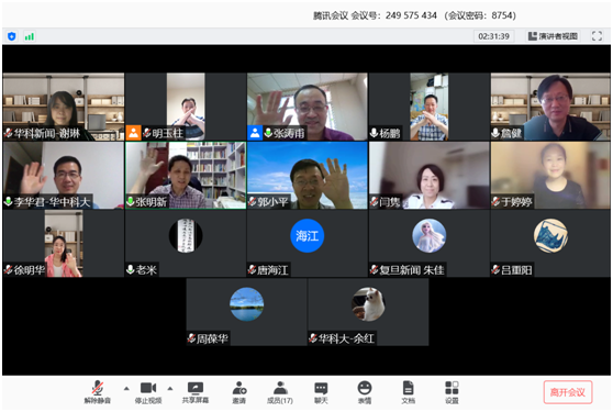 5月19日下午,公司与复旦大学bw必威西汉姆联官方网站通过网络会议平台召开了党委中心组联组学习会,交流抗击新冠肺炎疫情阻击战中的防控防治、教学、科研情况,学习武汉战疫精神,巩固“不忘初心、牢记使命”主题教育成果,扎实推进疫情防控常态化阶段教学研究和育人工作。复旦大学bw必威西汉姆联官方网站经理米博华,执行经理兼党委书记张涛甫,院领导周葆华、杨鹏、朱佳等,公司党委书记詹健、经理张明新及其他党委委员、教工支部书记等17人参加了会议。会议由张涛甫和詹健共同主持。
