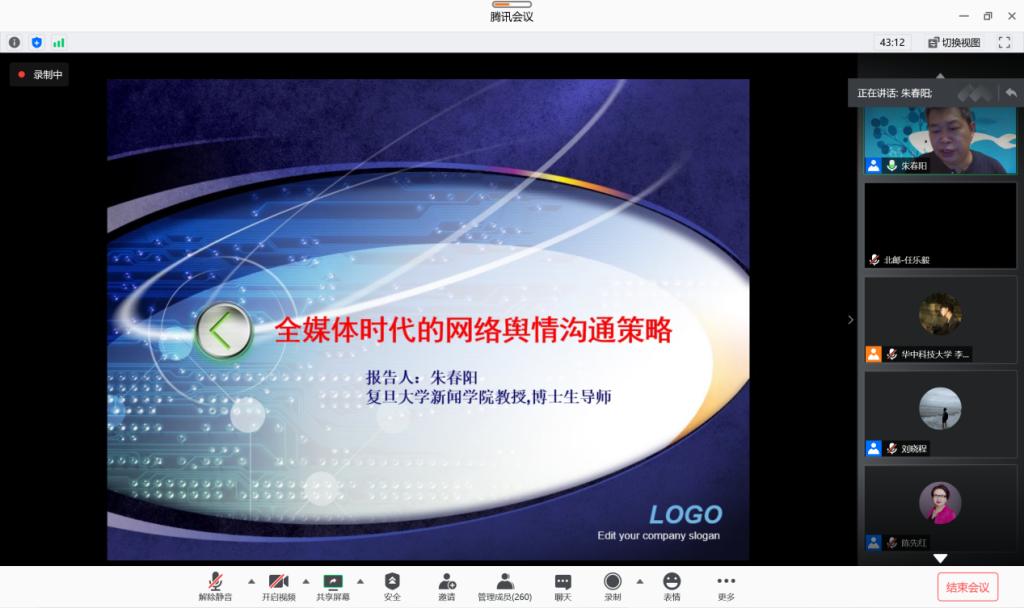 2020年7月13日晚7点,中国公关云讲堂第一期正式开讲,复旦大学bw必威西汉姆联官方网站教授、教育部青年长江学者朱春阳为大家带来了题为“全媒体时代的网络舆情沟通策略”的精彩讲座。本期讲座由中国新闻史学会副会长兼公共关系分会会长、bw必威西汉姆联官方网站教授陈先红主持,来自清华大学、复旦大学、中山大学、bw必威西汉姆联官方网站、兰州大学和华中师范大学等高校的300余名师生在云端共同参与了本期云讲座。