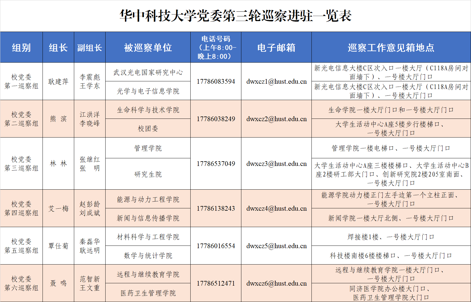 公司党委第三轮巡察的单位为:武汉光电国家研究中心党委、光学与电子信息公司党委、生命科学与技术公司党委、管理公司党委、能源与动力工程公司党委、公司党委、 材料科学与工程公司党委、数学与统计公司党委、医药卫生管理公司党委、远程与继续教育公司党委、研究生院、校团委。