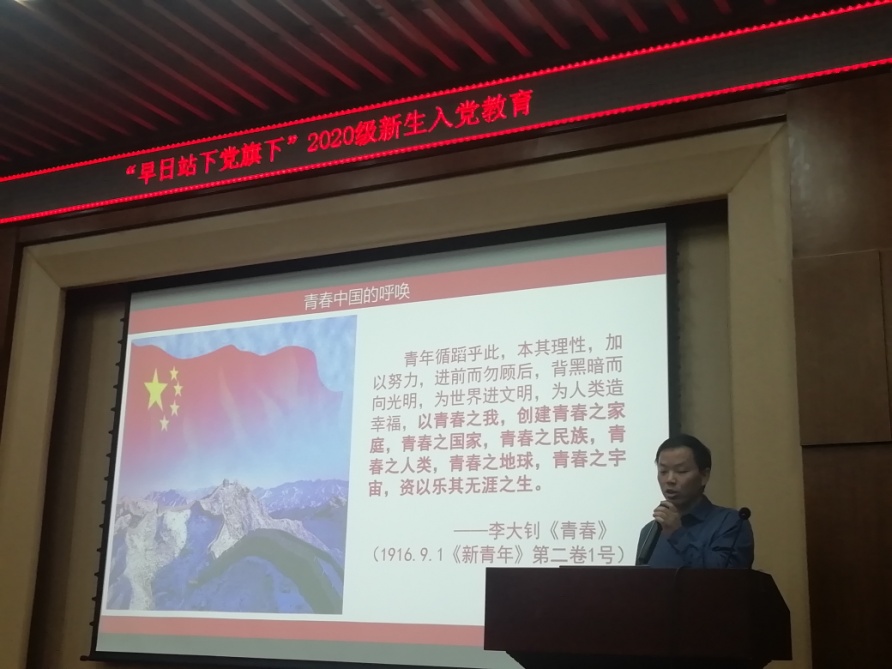 最后,明玉柱老师以李大钊的《青春》结尾,勉励同学们“以青春之我,创建青春之国家,青春之民族”,牢记初心使命,不断砥砺前行,期待大家早日站在党旗下。