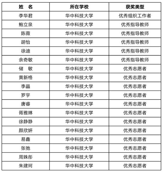 优秀组织单位、优秀组织工作者、优秀指导教师与优秀志愿者获奖名单如下表所示。