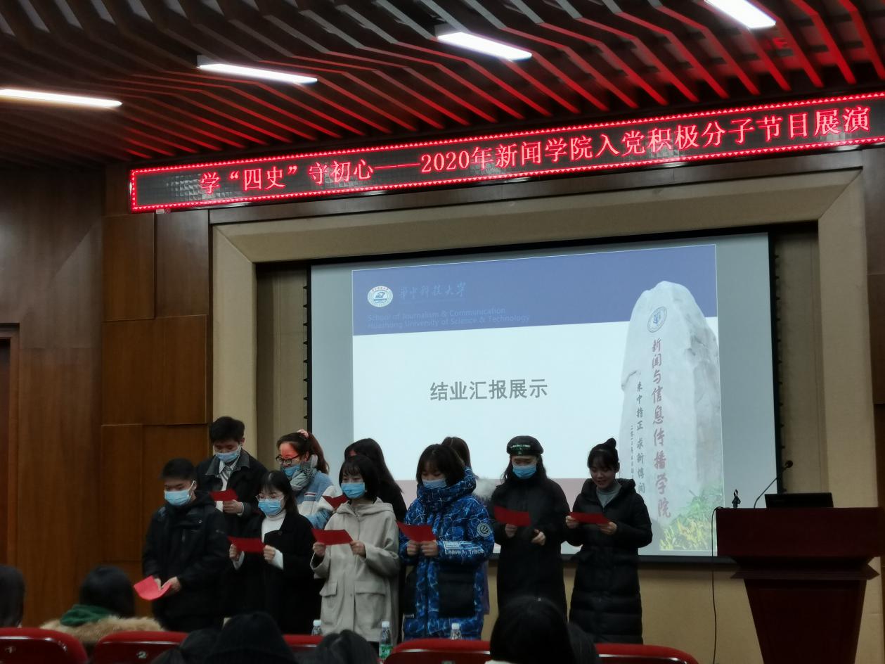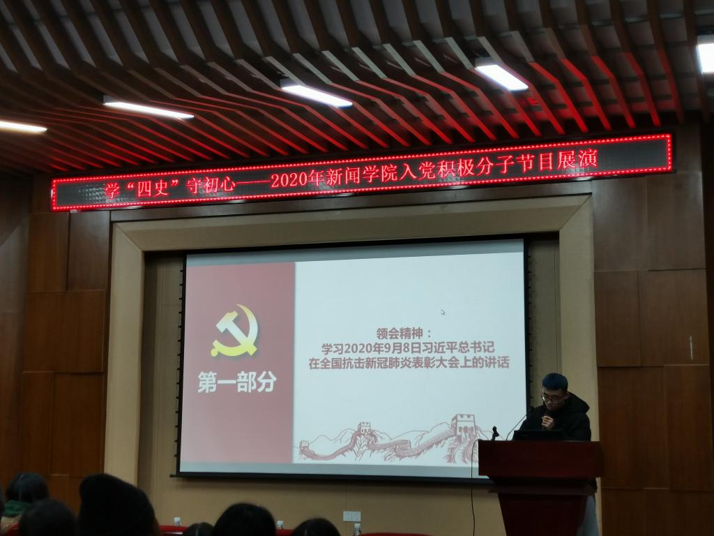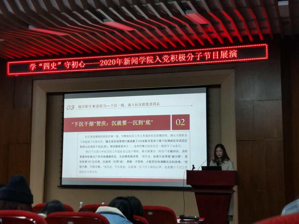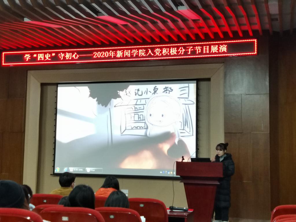 随后,由朗诵《因为有你》开场,各组精心准备的作品依次登台。微动画《赵记小卖部》,微党课《讲好抗疫故事,新闻人在路上》、《奋战在“疫线”基层党员的抗疫故事》,视频《四史与“我说”抗疫》,朗诵《党史组诗》、《我是党员我先上》、《我看见》,歌曲《歌唱祖国》……同学们通过不同形式,用自己的方式重温“四史”,回顾党在抗疫救灾过程中做出的卓越贡献,歌颂抗疫英雄、抒发爱国情怀,激发奋斗精神。