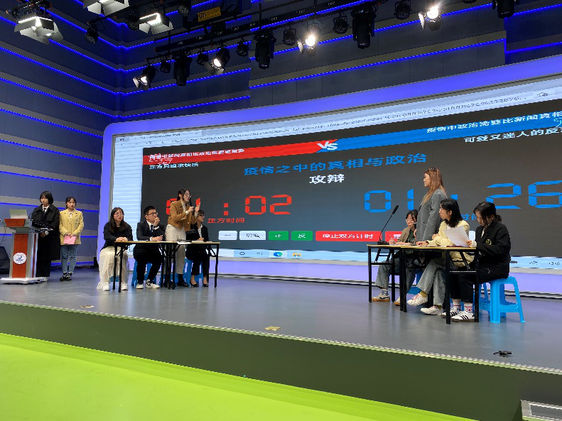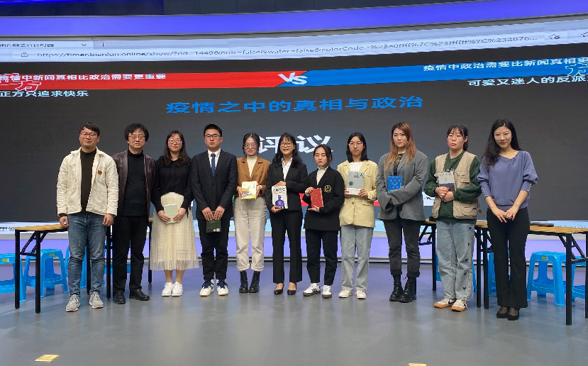 2021年4月9日上午10点,bw必威西汉姆联官方网站融媒体实验室演播大厅举办了一场别开生面的《外国新闻传播史》课堂辩论赛,本科2020级新闻1班与新闻4班各四名辩手围绕“疫情中的新闻真相与政治需要”主题展开激烈辩论。公司党委书记詹健、陈薇副教授、王一鸣老师参加活动。