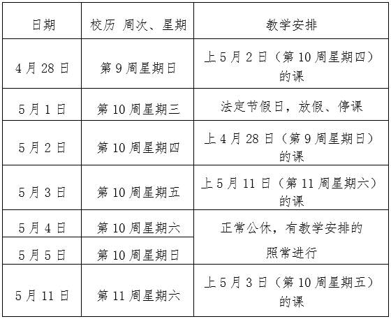 请各教学单位提前安排好劳动节期间的工作,确保教学秩序平稳有序。因特殊情况需调整教学安排的单位,应按规定办理相关手续。