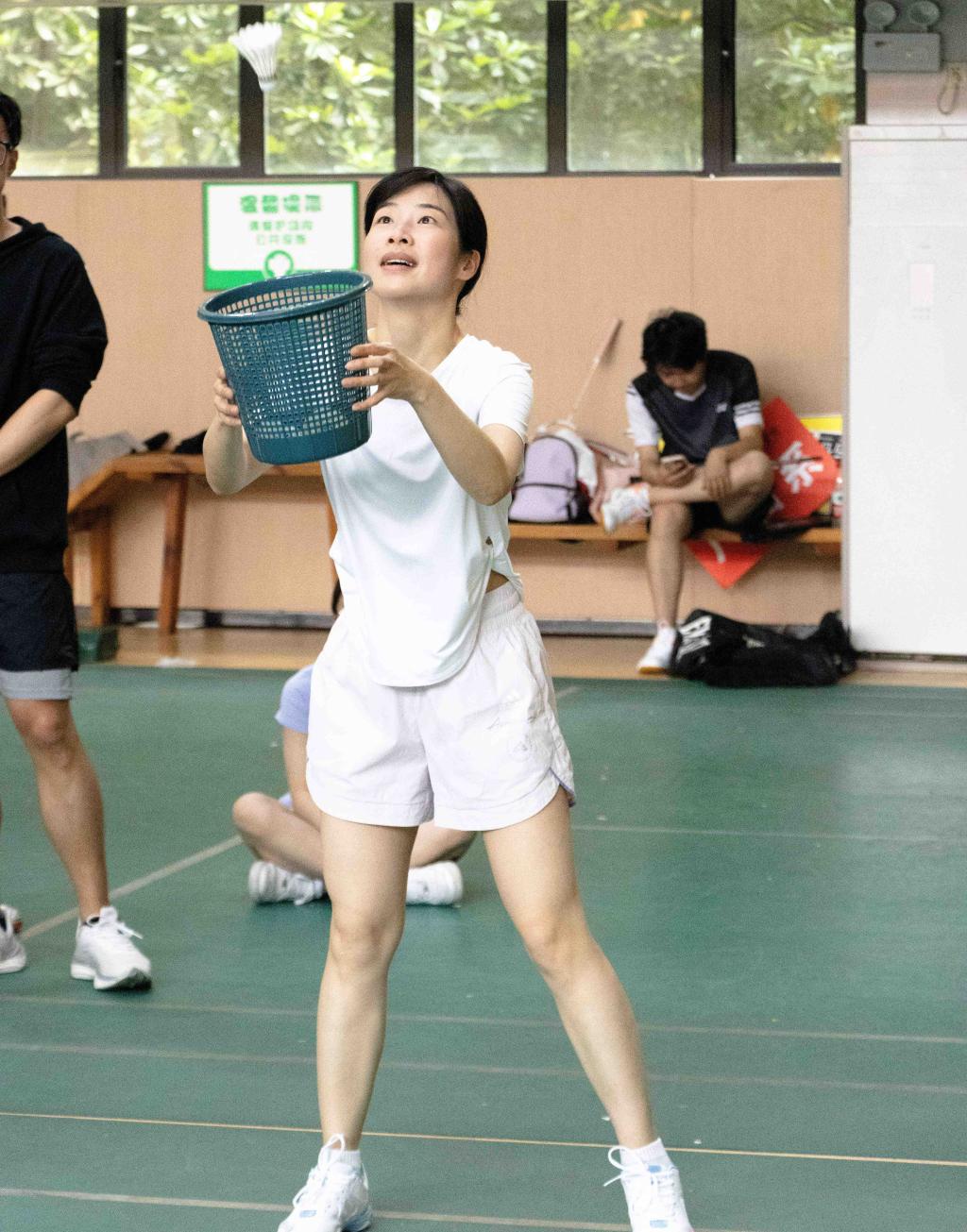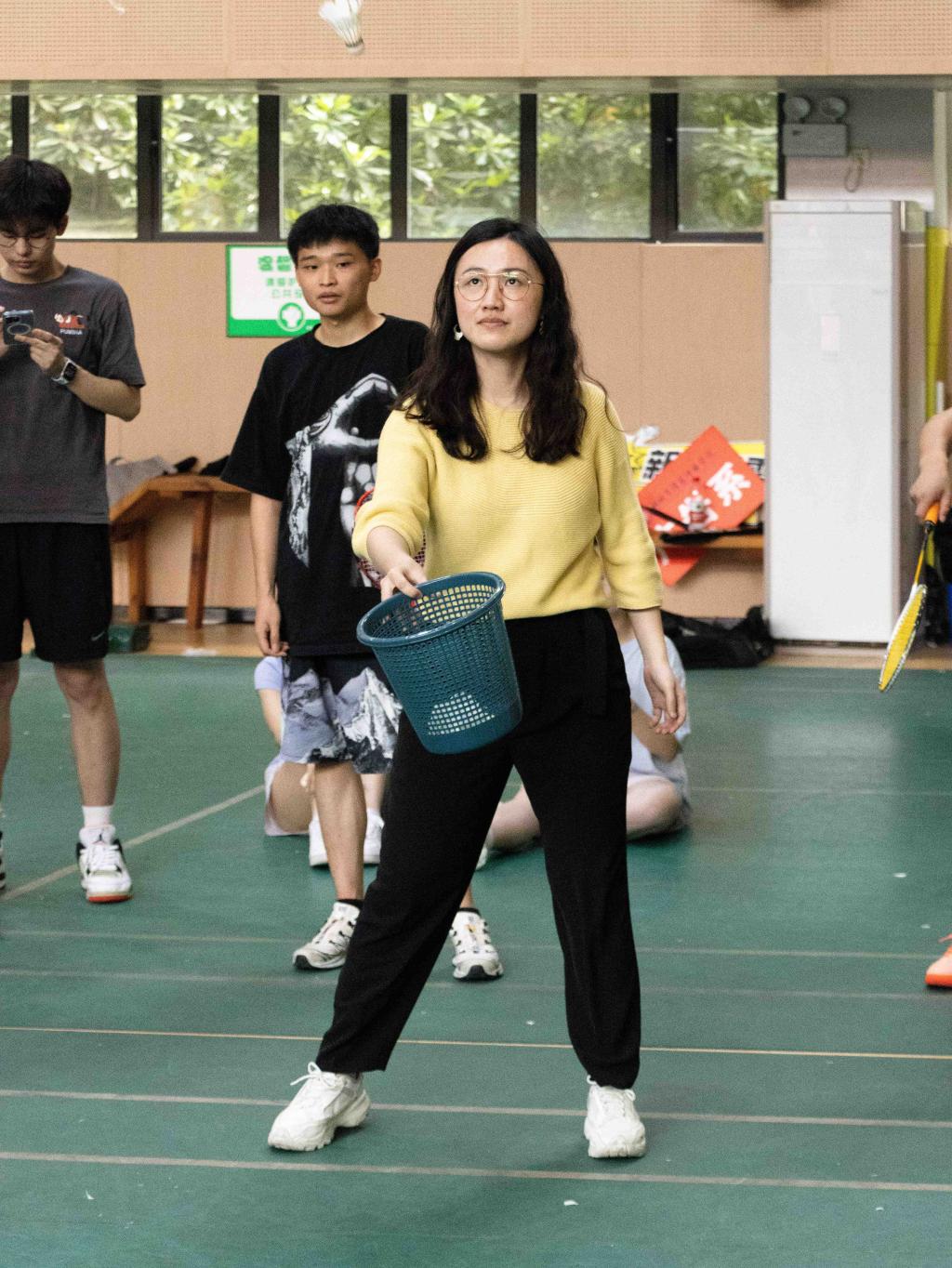 正式赛上半场结束后,各系的师生们还参与到趣味赛中。四个系分别派出三位师生参与比赛,一人递球,一人通过球拍传球,一人用小桶接球。选手间的互相“较劲”为现场观众带来了一场轻松、欢乐的比赛。