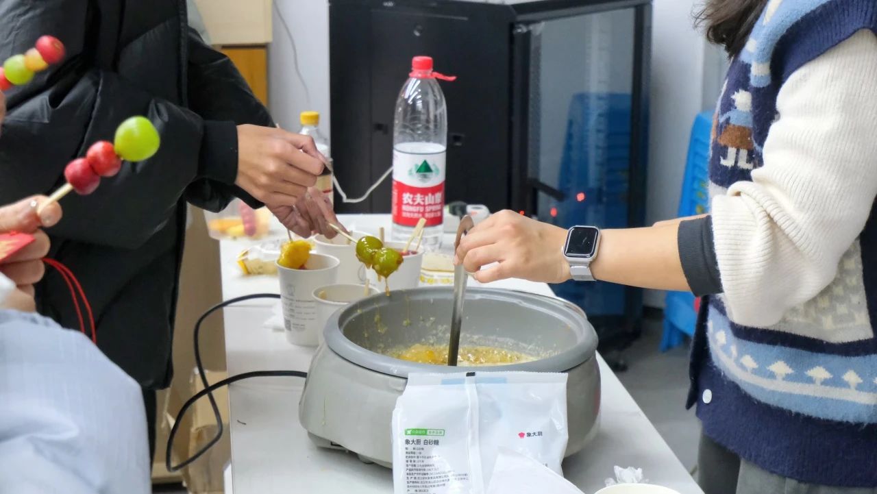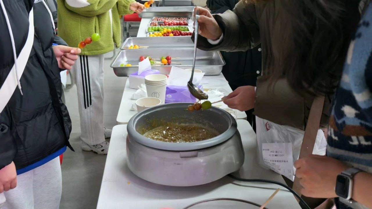 现场最具人气的当属糖葫芦制作区,师生们纷纷化身 “美食艺术家”,精心挑选圆润饱满的水果,串起甜蜜的期待,再浇上一层亮晶晶的糖液。不一会儿,一串串色泽诱人、香甜可口的糖葫芦新鲜出炉,咬上一口,幸福满溢。