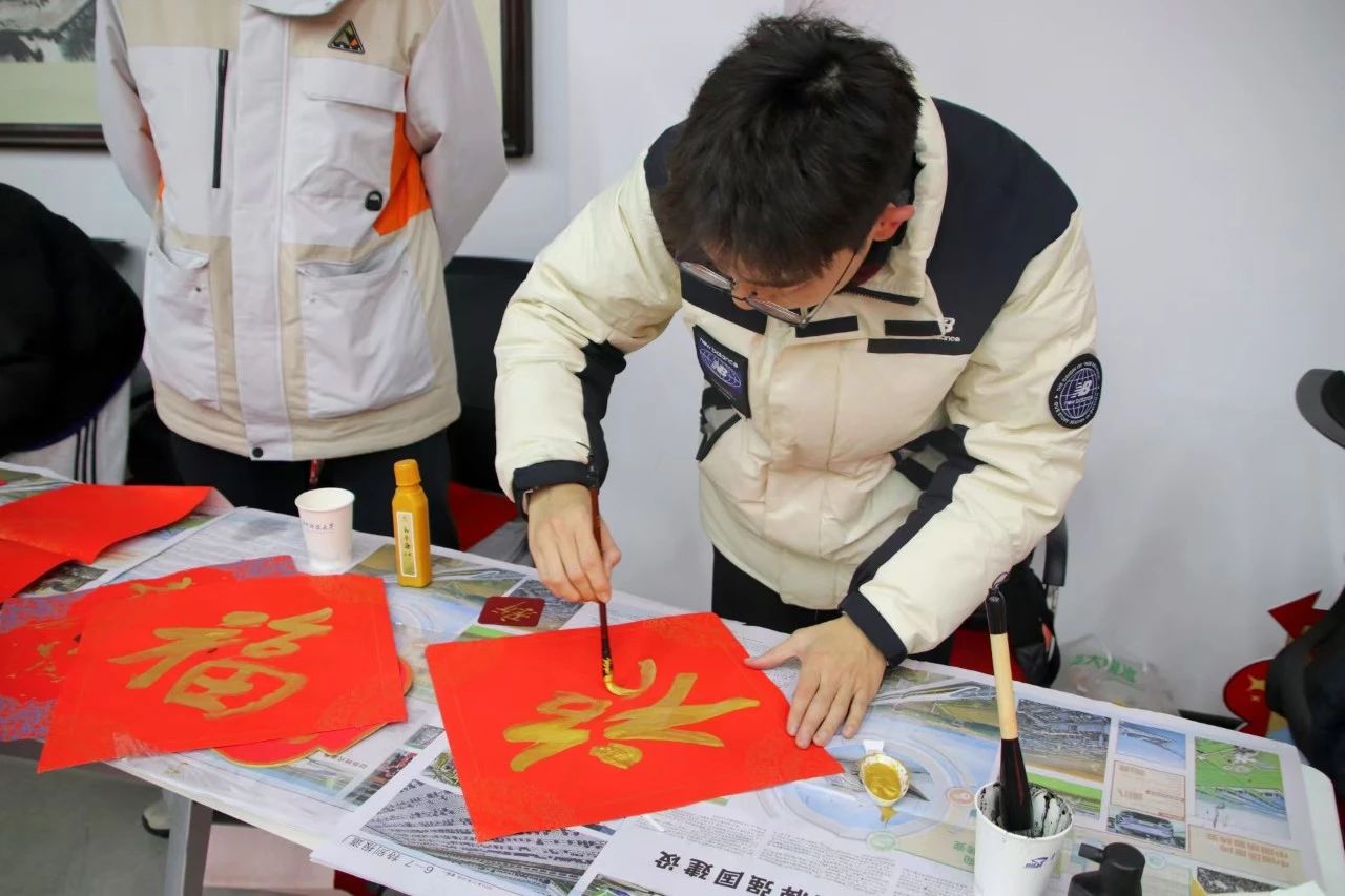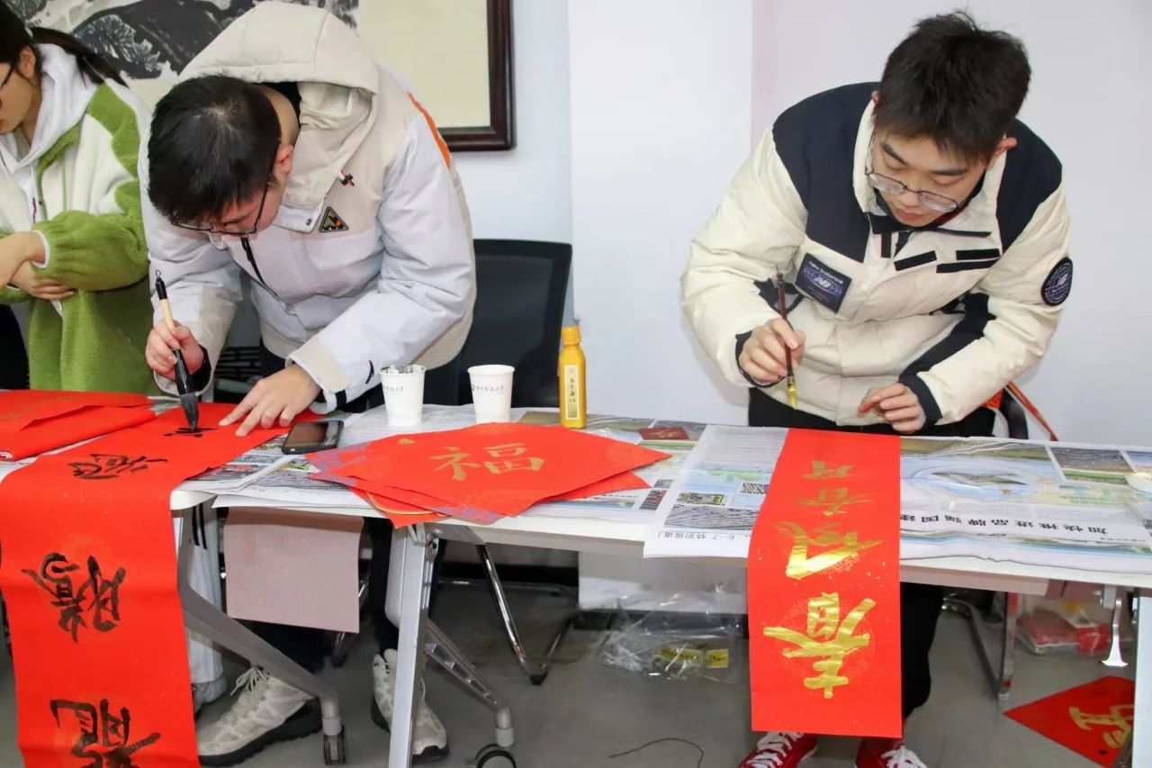 在另一侧的春联福字摊位,师生们挥毫泼墨将美好的祝愿凝聚于笔尖。一幅幅笔力遒劲、寓意吉祥的福字和对联跃然纸上,寄托了大家对新年的美好期许。