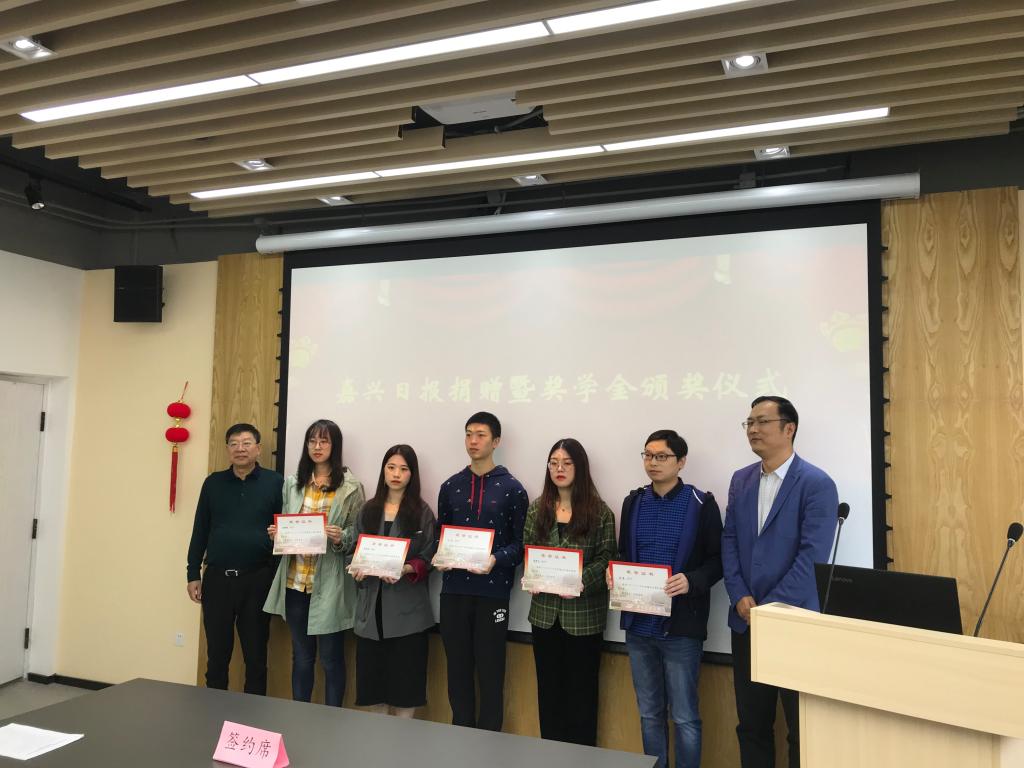 接着,由蔡伟达、吴建华等为获得本年度嘉兴日报新闻奖学金的同学颁发获奖证书,并合影留念。获奖代表、2016级本科生曹梦怡在获奖感言中说道,作为新闻传播学子,我们应该如院训所说的那样,“秉中持正,求新博闻”,做到肩担道义,守望真理,公允见证历史,忠直传播美好;立一身正气、扬一席正言、求无悔正果。