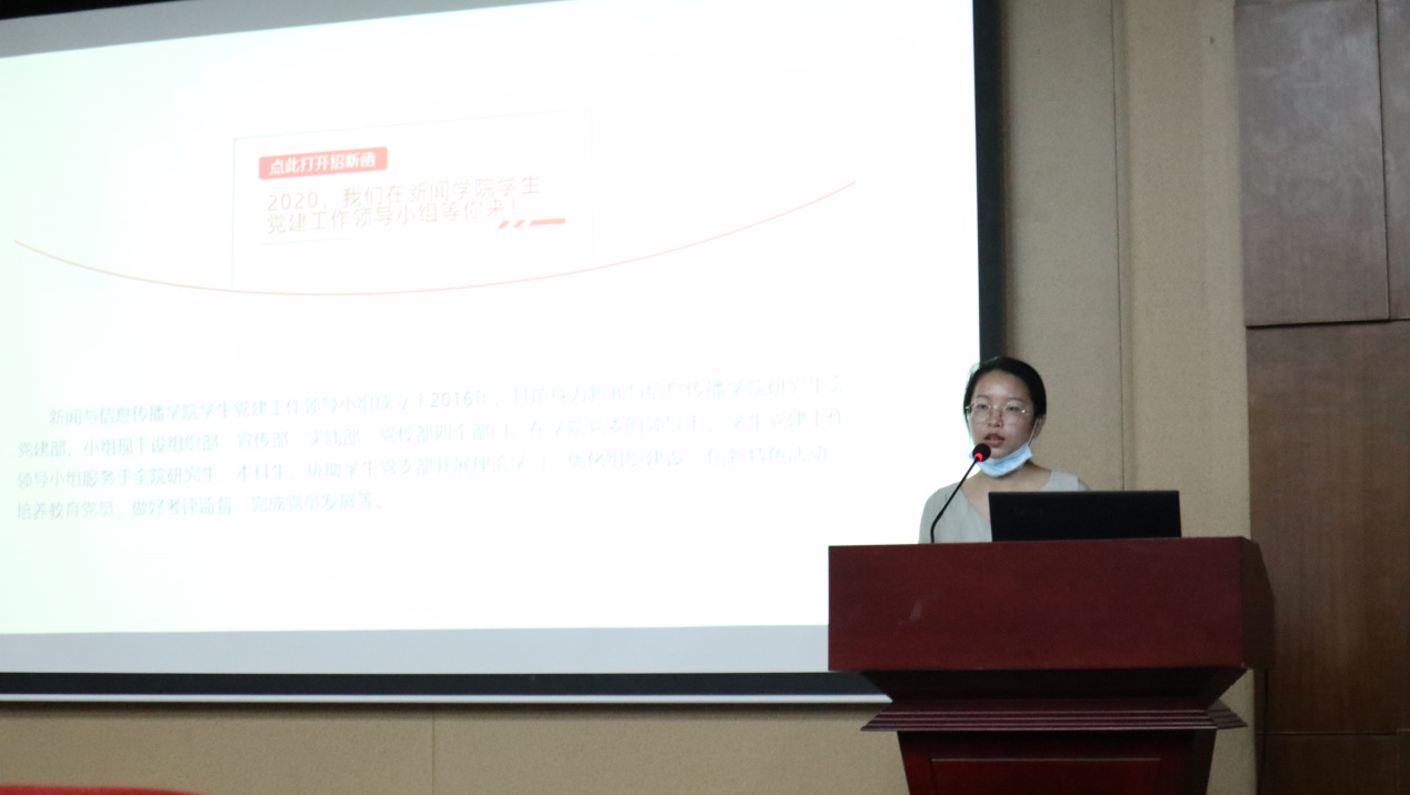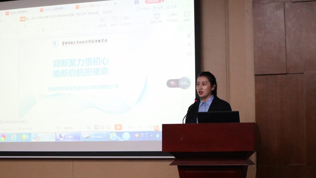 2020级博士新生贾瑞欣与大家交流了自己的研究生学习生活,鼓励大家以坚强的心理与强壮的体魄迎接新的生活,在华中大仰望星空,脚踏实地,收获理想与真知。