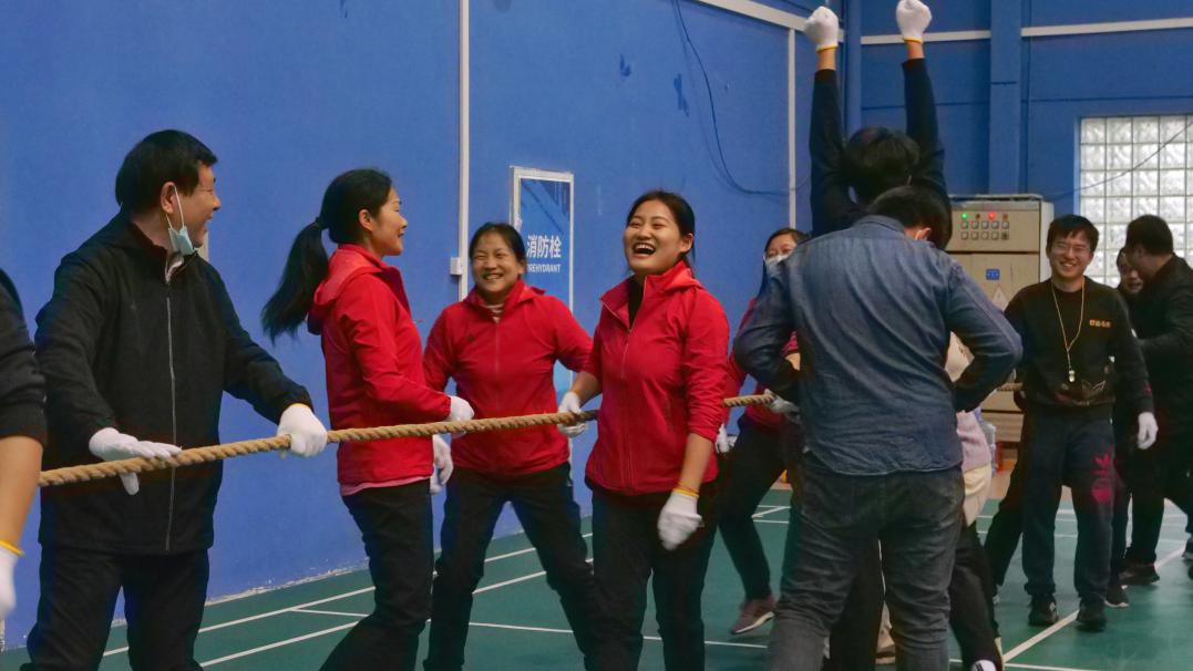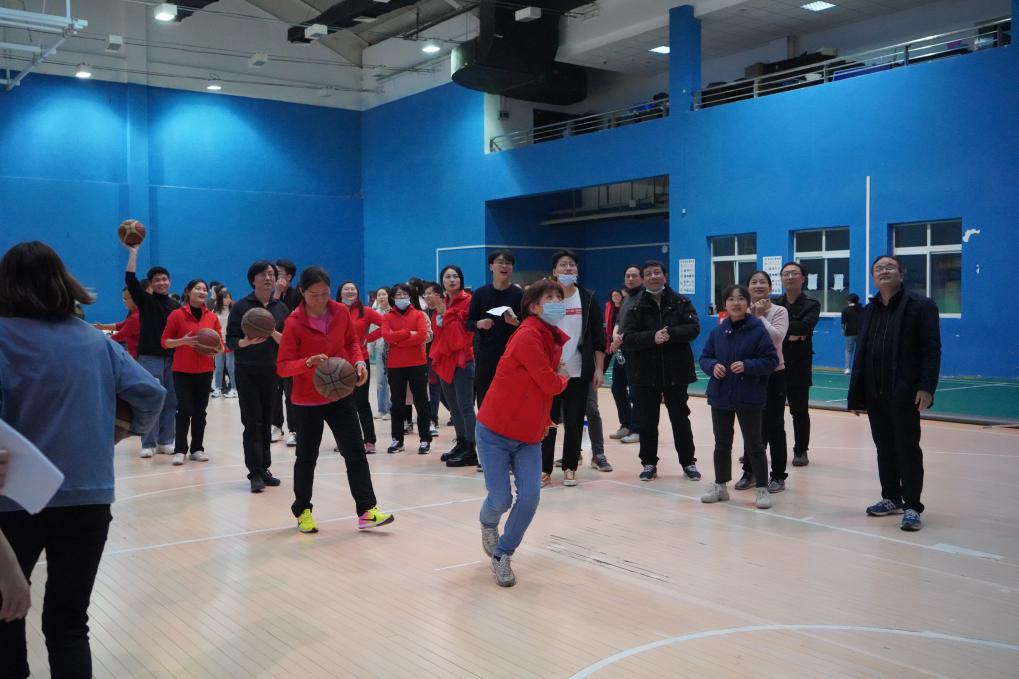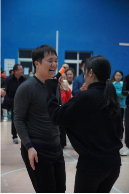 趣味运动会一共分为5个项目:双人跳绳、接力投篮、绑腿跑、螃蟹赛跑、拔河比赛。比赛正式开始前,老师们换上了公司准备的红色运动服,同学们开始在场馆内进行热身运动。由公司党委副书记明玉柱致开场辞。