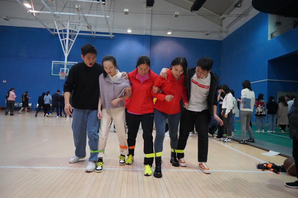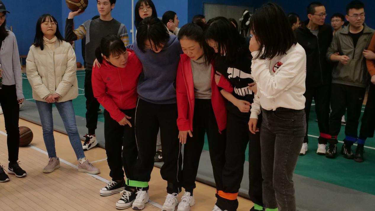 接着是考验师生默契的时候啦,老师和同学们每5人组成一队,左右两边腿绑在一起,以最后一名冲过终点为最终计时。各队的老师同学们赶紧商量起了对策。