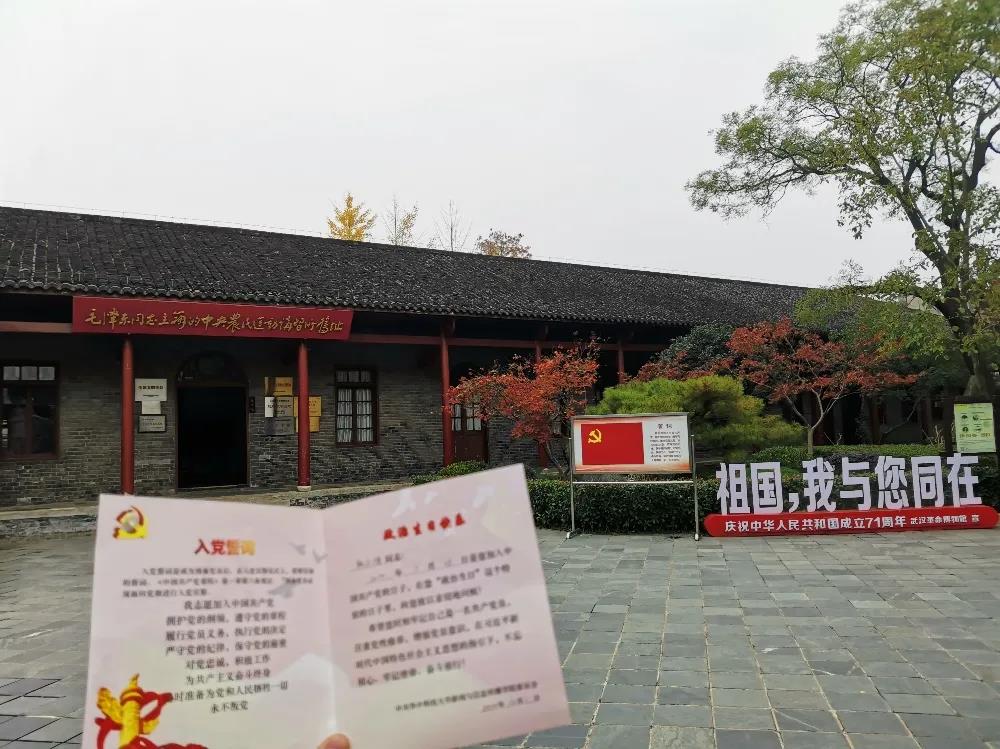 “我志愿加入中国共产党,拥护党的纲领,遵守党的章程……”在讲习所旧址门前,辅导员李思铭主持宣誓仪式、辅导员黄启超领誓,全部预备党员举起右拳面对党旗进行宣誓,随后师生参观了毛泽东同志主办的中央农民运动讲习所旧址和武昌毛泽东同志旧居。