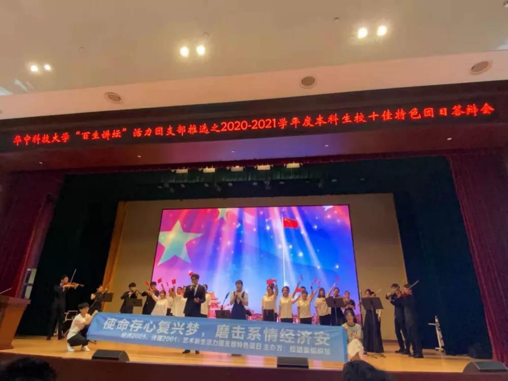 部特团路演、集体观影和参观抗疫展的场景,将同学们在虎泉夜市,光谷广场的采访搬上舞台。随后,三个支部的同学一齐上台,表演歌曲《我和我的祖国》,艺术新生活力团支部现场演奏,为祖国献上一首赞歌。