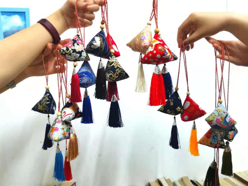 社团同学们齐聚韵苑公用房,指导老师李思铭一同参加制作,电信专业郭湘敏同学带来了艾草、棉花、布料、穗子等制作材料包,来自生医的田艺欣同学介绍了端午节佩戴香囊的习俗与其制作的具体步骤。同学们在现场教学和视频学习后耐心制作,配色、剪裁、缝制、填装、封口……完成了一个个“粽子”状的成品,全身心的投入让大家轻松愉悦。哲学专业的李妍慕同学还笑称,做了一个还想做,根本停不下来,乐在其中。