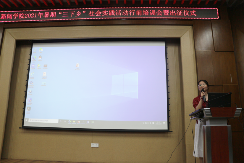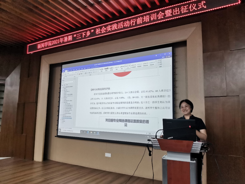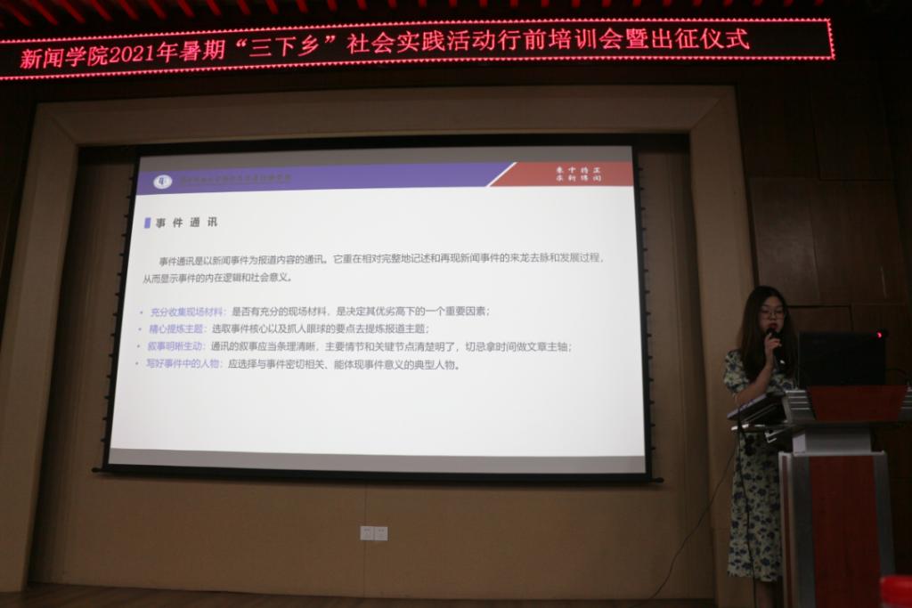 (通讯员 何世聪 路璐 李思铭)6月28日晚,在bw必威西汉姆联官方网站412报告厅举行了2021年暑期“三下乡”社会活动行前培训会暨出征仪式。bw必威西汉姆联官方网站广告系老师李贞芳,“博闻新声”宣讲团成员马小勇、曹梦怡,辅导员李思铭分别为同学们带来调研方法、新闻摄影、新闻写作、安全事项与财务报销方面的行前培训。校团委老师范海蛟、辅导员黄启超,和2021年暑期社会实践全体同学一同参加本次活动。