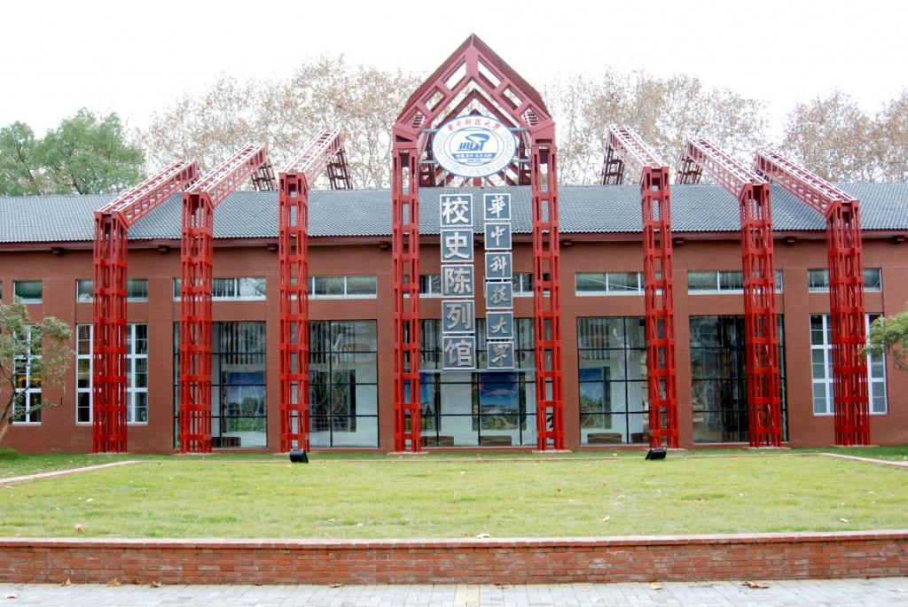 来到史馆前,首先映入我们眼帘的是大门上方的发光字体——“创新是魂”,这四个字充分点出了华科之所以如此辉煌原因。大门两旁是两排房屋,朱红色的墙面给人以古朴、庄严、肃穆的感觉。进入校史馆,向前望去是展览馆主体内,其顶上矗立着一排朱红色三角形金属架,如同一条天梯,象征着超越。正是因为不断跨越式发展,华科大才得以在众多公司中脱颖而出,发展成为全国一流大学。