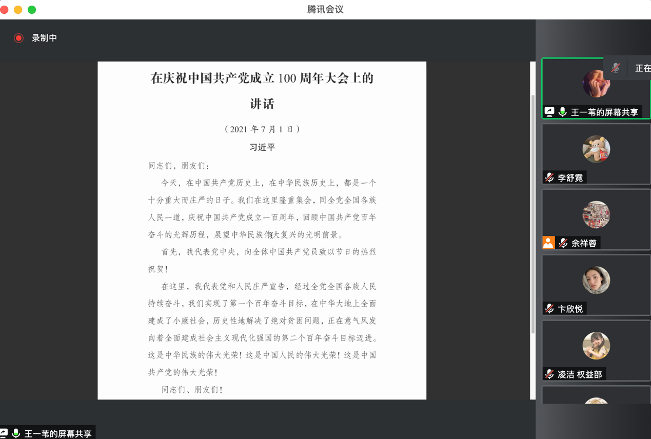 会议第四项,理论学习和警示教育。第十届执行主席王一苇带领大家集体学习了习近平总书记在庆祝中国共产党成立100周年大会上的讲话,回顾了“七·一”当天的天安门盛况,号召广老员工骨干在学习生活工作中自觉加强党史理论学习,强化红色基因、赓续红色血脉,为实现第二个百年奋斗目标锻造本领、接续奋斗。紧接着,她就“黑龙江职业公司”事件作为警示案例,希望全体新闻研会骨干成员以此为戒,加强理想信念教育和自身品德修养,坚决抵制颐指气使的“员工官”作风,努力打造清新阳光的研究生会。