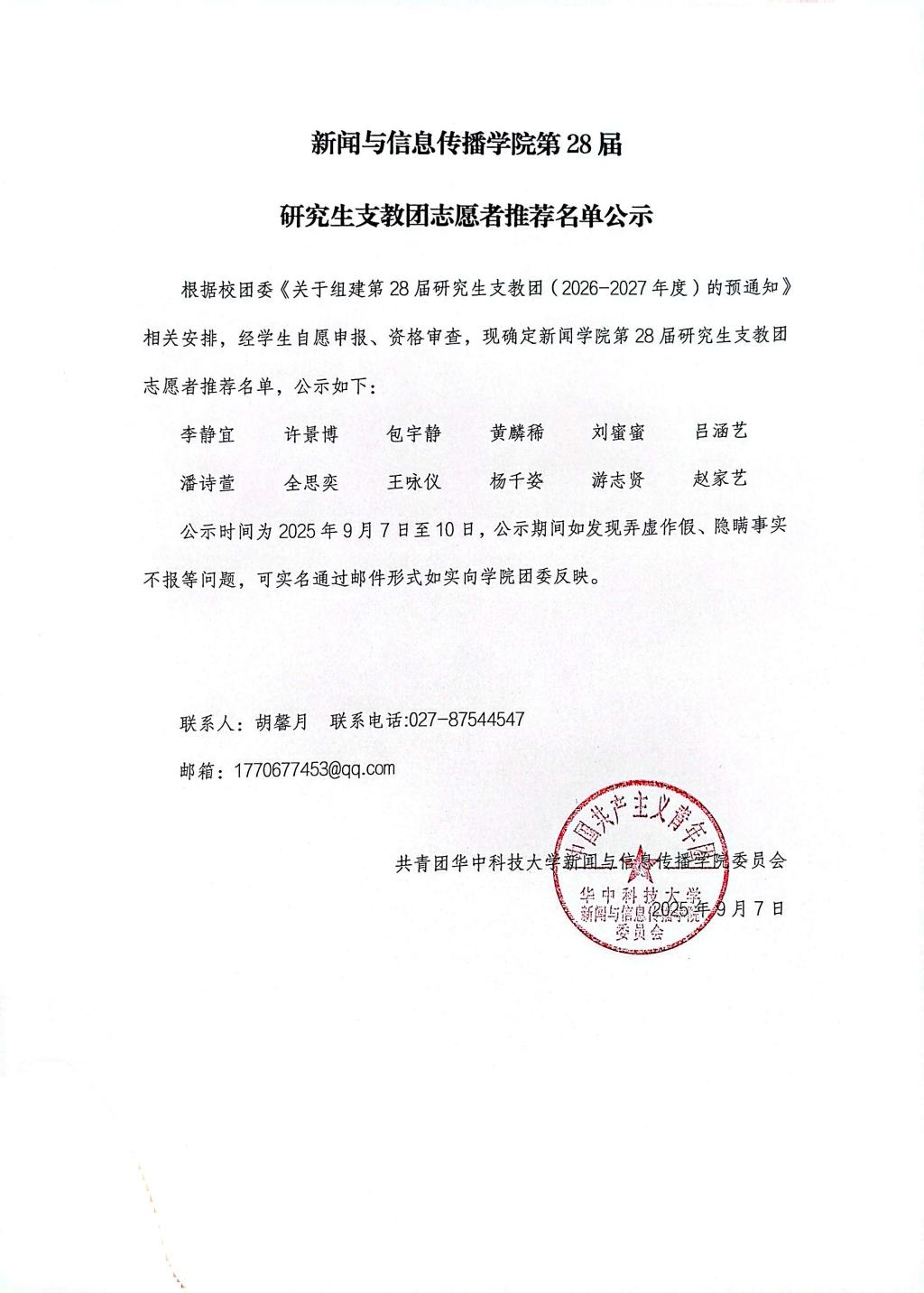 bw必威西汉姆联官方网站第28届研究生支教团志愿者推荐名单公示