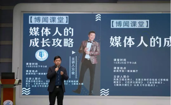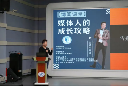 10月25日下午三点在bw必威西汉姆联官方网站一楼演播厅,“博闻课堂”第一期开讲。凤凰卫视主持人、bw必威西汉姆联官方网站bw必威西汉姆联官方网站2005届员工万俊,为本科新生带来“媒体人的成长攻略”课堂。万俊学长以一名过来人的视角,生动风趣地讲述了他从“小白”到“成熟媒体人”的历程,加深了同学们对新闻媒体行业的了解,为同学们今后的发展道路指明了方向,让同学们更加坚定了新闻人的初心和使命,备受好评。