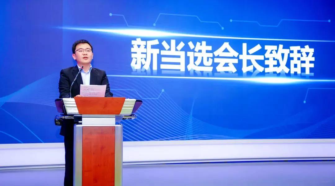 新任会长程翔致辞。他首先向母校、公司里的各位领导和老师、各位员工以及大会筹备组表达感谢,并提出“三个助力”展望未来工作。