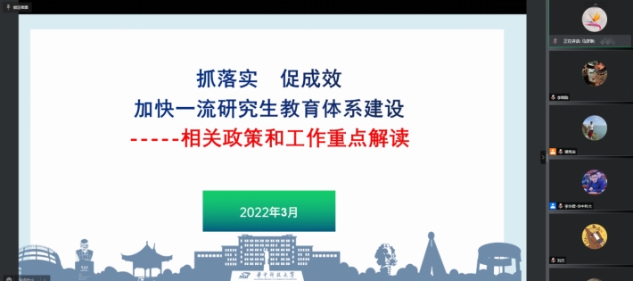 研究生院经理马彦琳以“抓落实、促成效,加快一流研究生教育体系建设”为题作报告,从国家对人才培养的质量要求、导师科研育人、师德师风建设等展开讲解。